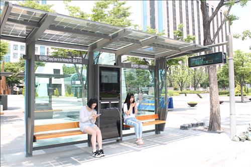 서울 세종로 버스정류장서 태양광으로 스마트폰 충전