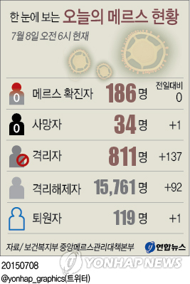(서울=연합뉴스) 김병규 전명훈 기자 = 중동호흡기증후군(메르스)으로 인한 사망자가 8일 만에 2명이나 발생했다. 추가 환자는 사흘째 나오지 않았으며 완치자는 1명 늘어났다.