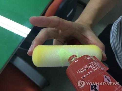 △ '절도범 저리 가' 특수형광물질 (서울=연합뉴스) 서울 도봉경찰서는 특수형광물질을 이용해 절도 발생 건수를 대폭 줄였다고 9일 밝혔다. 2015.7.9 << 서울 도봉경찰서 제공 >> photo@yna.co.kr (끝) |