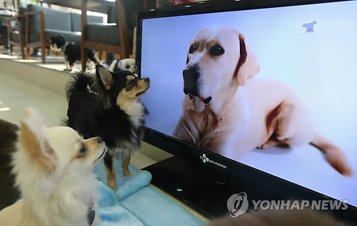 △ 서울의 한 애견카페에서 애완견들이 디지털케이블방송인 도그(DOG)TV를 시청하며 놀고 있다.(연합뉴스 자료사진) |