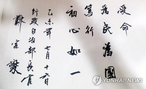 △ 정종섭 장관이 쓴 안중근 기념관 방명록 (서울=연합뉴스) 정종섭 행정자치부 장관이 취임 1주년을 하루 앞둔 16일 출근 전 서울 남산 안중근 의사 기념관을 방문해 쓴 방명록. 정 장관은 방명록에 '受命 爲民爲國, 篤行 初心如一'(수명 위민위국, 독행 초심여일)이라는 글귀를 남겼다. 2015.7.16 << 정종섭 장관 페이스북 캡처 >> photo@yna.co.kr |