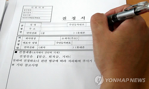△ 임금을 제 때 못받은 근로자가 진정서를 작성하고 있다. |