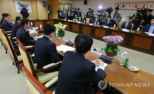 | △ 지난 4월 9일 서울 세종로 정부서울청사에서 열린 제17차 노동시장구조개선특위 회의에서 참석자들이 김대환 경제사회발전 노사정위원장의 발언을 듣고 있다. 이날 열린 노동시장구조개선 특위에는 8일 불참을 선언한 한국노총을 제외한 정부와 노사정위원회, 경총 관계자만 참석했다. |