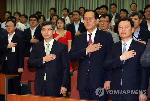 △ 이득홍 신임 서울고검장 취임식 (서울=연합뉴스) 박동주 기자 = 이득홍 신임 서울고검장(앞줄 오른쪽 세번째)이 21일 오전 서울 고등검찰청에서 열린 취임식에서 국기에 대한 경례를 하고 있다.