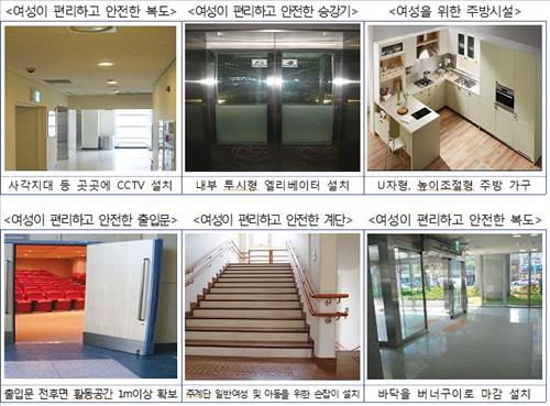 복도의 계단 손잡이는 여성과 아이들이 잡기 편하게 높이를 조절하고 공중화장실은 남·녀 화장실을 완전히 분리하고 칸마다 선반과 비상벨을 설치하도록 권고했다.