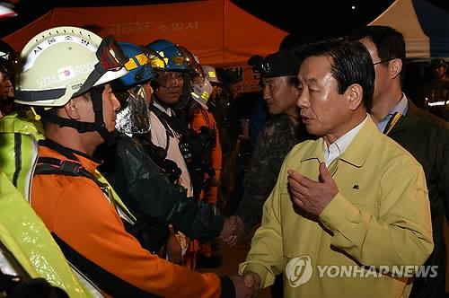 △ 올해 5월 지하철 유독가스테러 대비 훈련 후 현장에서 소방관을 격려하는 박인용(사진 오른쪽) 안전처 장관. |
