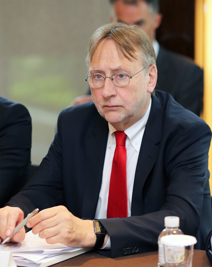 (서울=포커스뉴스) 17일 오후 서울 웨스틴 조선호텔 로즈룸에서 한-EU FTA 발효 5주년 평가를 위해 방한중인 베른트 랑에(Bernd LANGE, 사회당 소속) 유럽의회 국제통상위 의장이 한-EU FTA를 포함한 양측 통상정책과 한국의 향후 FTA 추진방향 등에 관해 의견을 교환하고 있다. <사진제공=산업통상자원부>