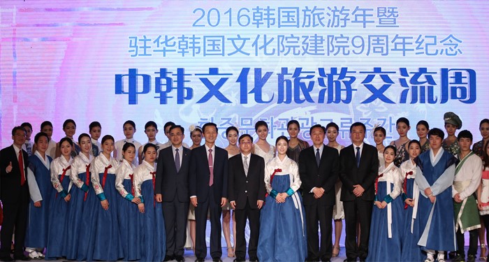 (서울=포커스뉴스) 18일 김종 문화체육관광부 차관이 중국 베이징에서 열린‘2016 한국 관광의 해’ 및 베이징 주중 한국문화원 개원 9주년 기념행사인 ‘한중문화관광교류 주간 개막행사’에 내빈들과 기념촬영을 하고 있다. <사진제공=문화체육관광부>
