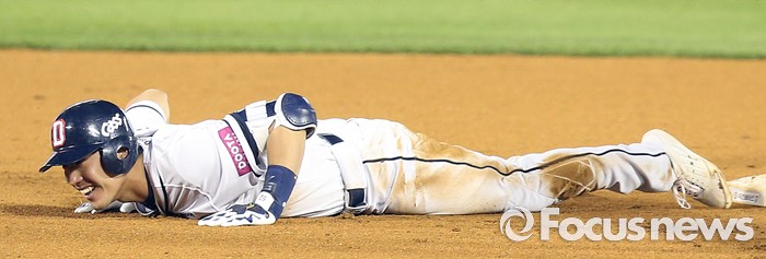 (서울=포커스뉴스) 23일 서울 잠실구장에서 열린 2016 프로야구 kt-두산 경기 7회말 두산 김재호가 좌익수 왼쪽으로 빠지는 안타를 치고 2루까지 달리다 태그아웃된 후 그라운드에 엎드려 있다.