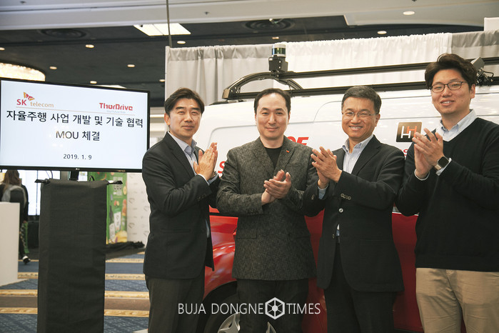 SK텔레콤은 9일 오후(현지시각) 세계 최대 IT·가전 전시회 ’CES 2019’가 열린 미국 라스베이거스에서 토르드라이브와 ‘자율주행 사업 개발 및 기술 협력을 위한 양해각서(MOU)’를 체결했다고 밝혔다. 이날 체결식에는 SK텔레콤 장유성 AI/Mobility사업단장, 토르드라이브 서승우 창립자 등이 참석했다.