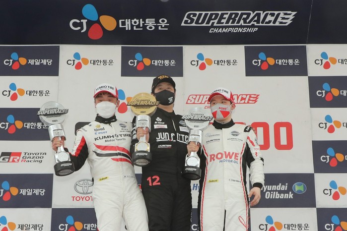 [사진설명] 지난 5월 에버랜드 스피드웨이에서 열린 2021 CJ대한통운 슈퍼레이스 챔피언십 1라운드 슈퍼 6000 클래스 포디움에 오른 정의철, 황진우, 이찬준(왼쪽부터)