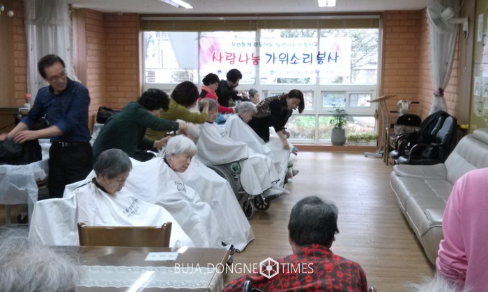 | △ 광주광역시 서구가 대한미용사회 서구지회와 미용자원봉사자가 연계해 복지시설 노인들을 대상으로 미용봉사활동을 벌이고 있다. <사진제공=서구청> |