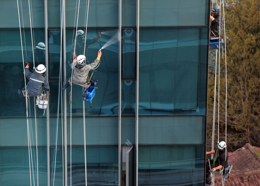 6일 서울 종로구의 한 빌딩에서 관계자들이 외벽 물청소를 하고 있다. 2025.4.16