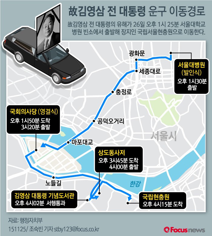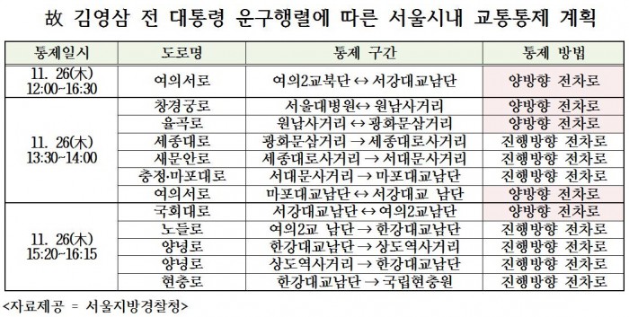 [부자동네타임즈 이영진 기자] 26일 고(故) 김영삼 전 대통령의 영결식이 진행되는 가운데 운구행렬 경로에 따라 이날 오후 서울시내 일부 구간의 교통이 통제된다.