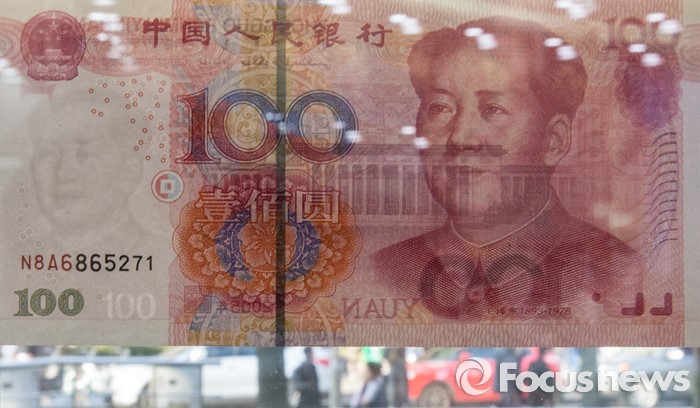 △ 중국 위안화의 국제통화기금 특별인출권(SDR) 통화바스켓 편입이 결정된 1일 오전 서울 중구 KEB 하나은행 로비에 전시된 중국 100위안화 너머로 시민들이 지나가고 있다. <사진제공=포커스뉴스>