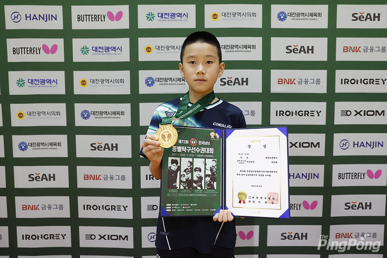 강도현 학생은 지난 20~27일 대전 한밭체육관에서 열린 ‘제72회 전국남녀종별 탁구선수권대회’ 초등 남자부 개인 단식 결승전에서 대구 대실초등학교 서현규 학생(6학년)을 세트 스코어 3대 1로 누르고 금메달의 영예를 안았다.