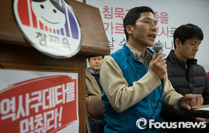 | △ 지난 9일 전교조 본부에서 이용기 정책실장이 역사교과서 국정화 방침 철회를 요구하며 기자회견을 하고 있다. <사진제공=포커스뉴스> |