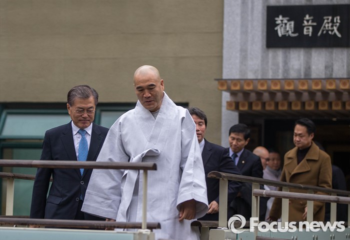 △ 문재인(왼쪽) 새정치민주연합 대표가 지난달 29일 오후 서울 종로구 조계사를 예방해 조계사 주지스님과 면담 후 화쟁위원회와 회의를 위해 발걸음을 옮기고 있다. <사진제공=포커스뉴스>