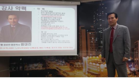 | △ 범대진 박사가 강의에 앞서 자신의 약력을 소개하고 있다. |