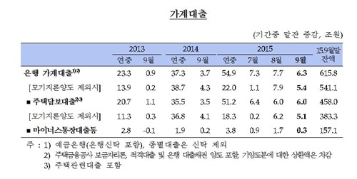 지난해 9월 은행 가계대출은 3조7000억원 늘었고 2013년 9월에는 9000억원 증가했었다. 이로써 올해 1~9월 가계대출 증가폭은 54조9000억원으로 지난해 같은 기간(37조3000억원)을 크게 웃돌았다.
