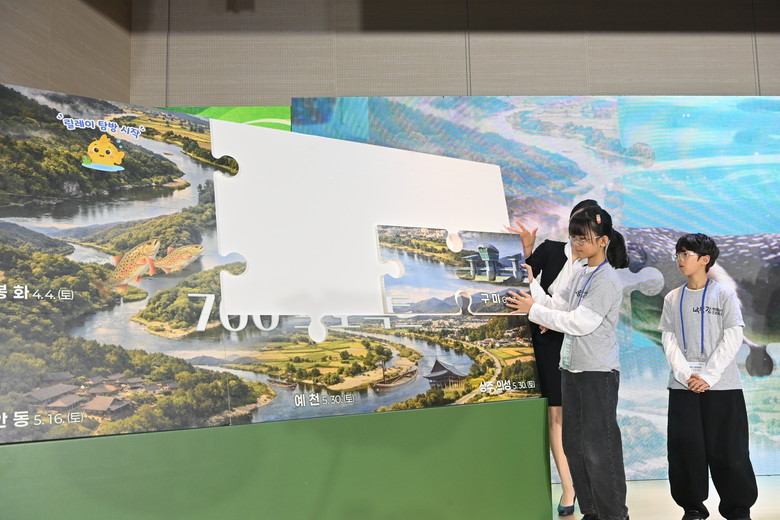 개막식의 하이라이트는 낙동강 물길을 하나로 잇는 대형 퍼즐 퍼포먼스였다. 낙동강이 흐르는 9개 시군(봉화, 안동, 예천, 상주, 의성, 구미, 칠곡, 고령, 성주)의 생태적 특징을 담은 퍼즐 조각들이 하나씩 맞춰지며 거대한 낙동강 지도가 완성됐다. 마지막 퍼즐이 부착되자 축포와 함께 완성된 지도가 빛을 발하며 낙동강 700리 생명의 물길을 따라 이어질 탐방의 시작을 알렸다.