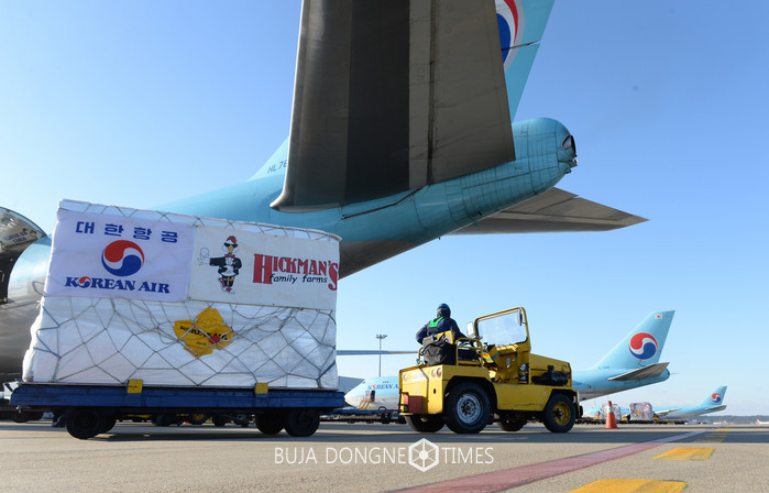 화물칸의 문이 열리고 비닐 포장으로 꽁꽁 싸맨 단위 용기가 모습을 드러냈다. 단위 용기 겉면에는 '대한항공'과 HICKMAN'S family farms'의 사기(社旗)가 걸려 있었다.