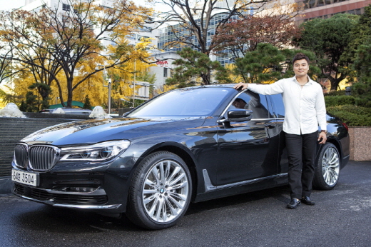 △ 추신수 선수가 지원 받은 의전차량 BMW 뉴 7시리즈 옆에서 기념촬영을 하고 있다. <사진제공=BMW코 리아> |