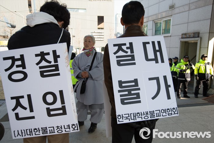 | △ 1일 오전 서울 종로구 조계사 일주문 앞에서 대한불교청년회 회원들이 '경찰진입 절대불가'가 적힌 피켓을 두르고 있는 가운데 법복을 입은 한 시민이 피켓을 내리라며 항의하고 있다. <사진제공=포커스뉴스> |