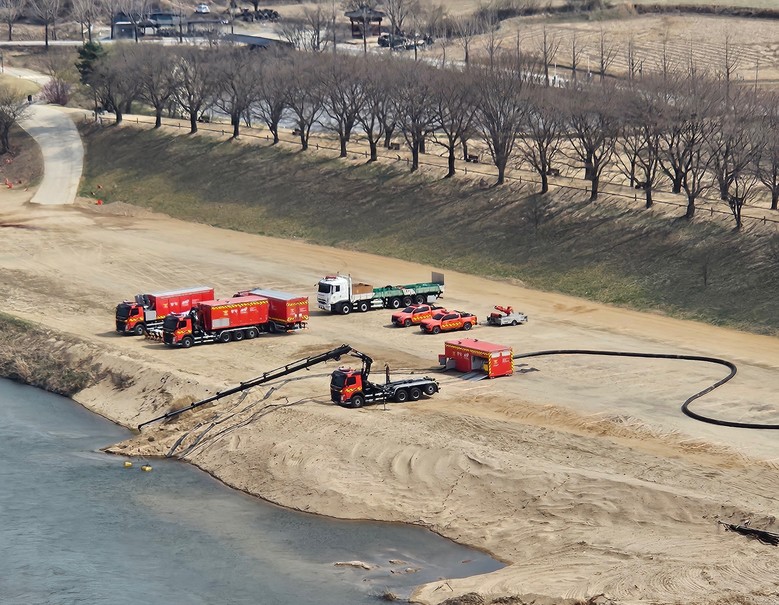 328일 하회마을과 인접한 안동댐 하류 경북 안동시 풍천면 인근 낙동강 본류에서 산불 진압을 위한 소방 용수가 취수되고 있다.