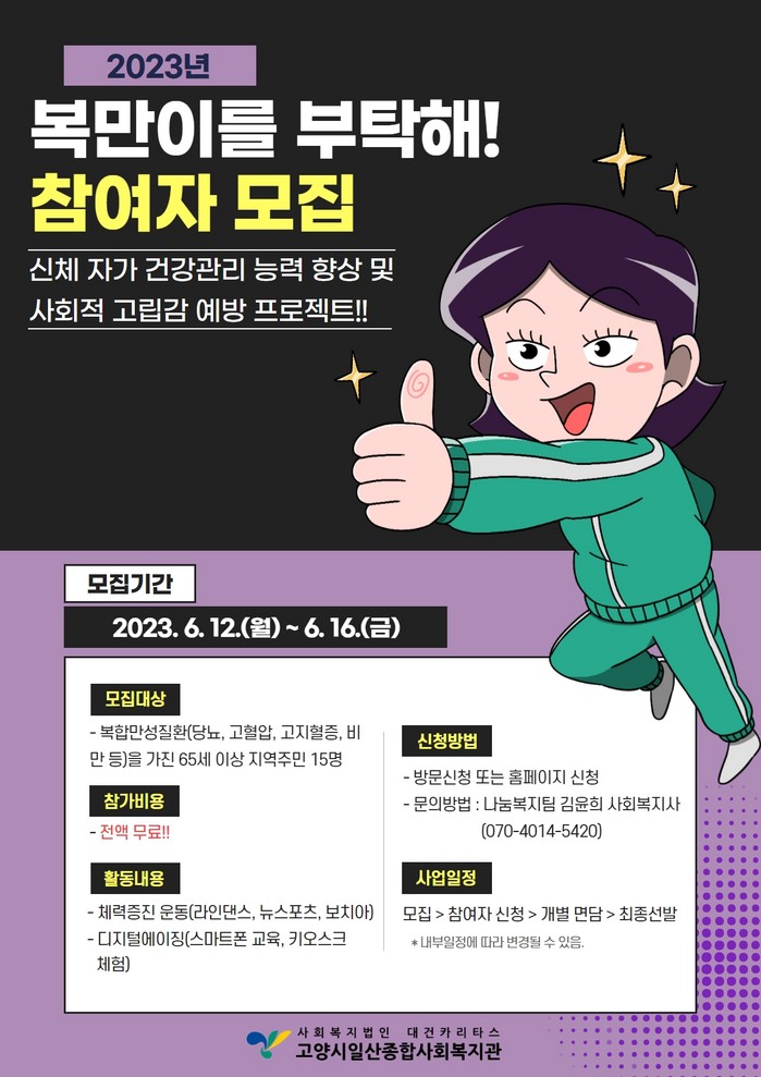 [부자동네타임즈 김인수기자] 고양시일산종합사회복지관(관장 최찬영)은 6월부터 11월까지 복합만성질환을 가진 노인의 신체적 자가 건강관리 능력 향상과 사회적 고립 예방을 위한 신체·사회 통합 증진 프로그램 ‘복만이를 부탁해!’를 진행한다.