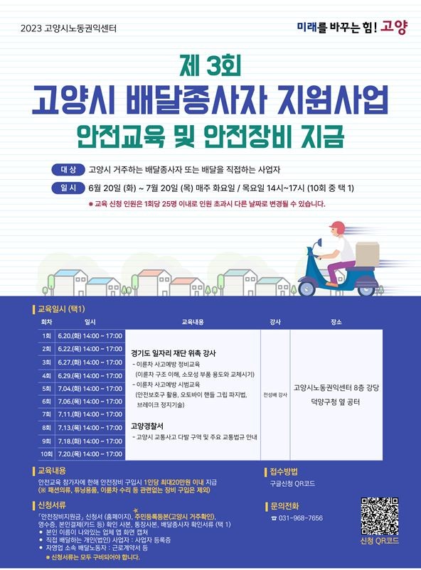 지원을 희망하는 배달종사자는 6월 20일(화)부터 7월 20(목)까지 고양시노동권익센터에 프로그램을 신청하면 된다. 지원 대상은 고양시에 거주하는 이륜차(오토바이, 전기자전거, 킥보드, 자전거 등)를 이용한 배달종사자이다.