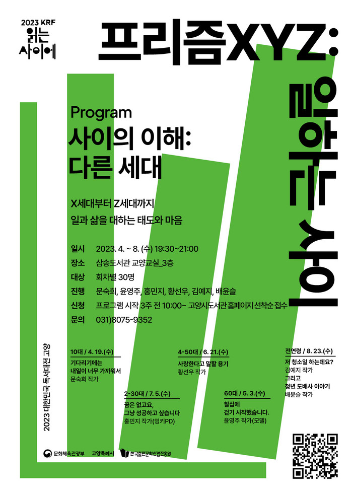 고양시는 제10회 ‘2023 대한민국 독서대전’ 유치를 기념해 기획 프로그램 <프리즘 XYZ: 일하는 사이〉를 운영하고 있다. 이 프로그램은 각기 다른 세대의 시선으로 일이라는 주제를 바라보고 이야기하는 프로그램이다. 도서관은 연령대별로 ‘일’에 대해 생각할 거리를 던져주는 도서를 선정하여 해당 도서의 저자와 독자들이 직접 만나는 자리를 기획했다.