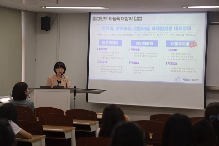 [사진설명] 홍정민 의원이 중앙대학교 사회복지대학원에서 아동보호정책을 주제로 강연하고 있다.