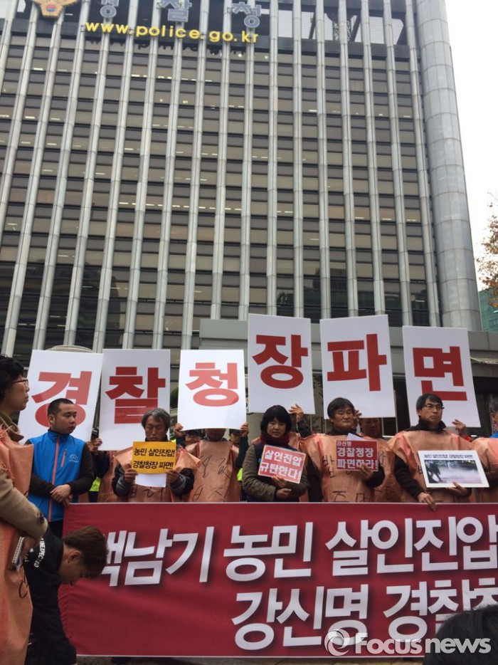 [부자동네타임즈 이영진 기자] 서울 광화문 일대에서 열린 ‘민중총궐기’ 집회에서 경찰의 과잉진압에 대한 논란이 일고 있는 가운데 농민들이 경찰의 물대포를 맞고 쓰러진 백남기(69)씨에 대한 관련 경찰 책임자 처벌과 강신명 경찰청장을 파면을 촉구했다.
