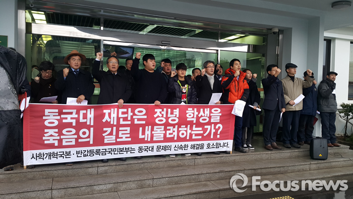 반값등록금국민본부와 사학개혁국민본부는 2일 오전 10시 30분 서울 중구 동국대에서 기자회견을 열고 "학생들이 고공 농성을 벌이고 목숨을 건 단식을 해도 동국대 재단과 학교 측은 사태 해결에 나서고 있지 않다"며 "49일째 단식을 이어온 김건중 부총학생회장의 생명을 살리기 위해서라도 사태를 조속히 해결해야 한다"고 촉구했다.