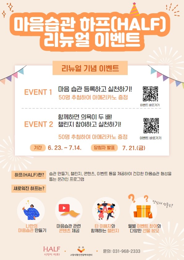 [부자동네타임즈 김인수기자] 고양특례시 일산동구보건소 고양시정신건강복지센터(센터장 이정석)는 23일 ‘마음습관 하프(HALF)’ 새 단장을 기념해 이벤트를 개최한다고 밝혔다.