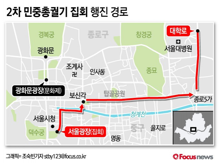 이후에는 서울광장에서 출발해 청계천을 따라 보신각을 거쳐 종로 2~5가를 통해 백남기 농민이 입원해 있는 서울대병원 후문이 있는 대학로까지 3.5km 행진을 이어갈 방침이다.