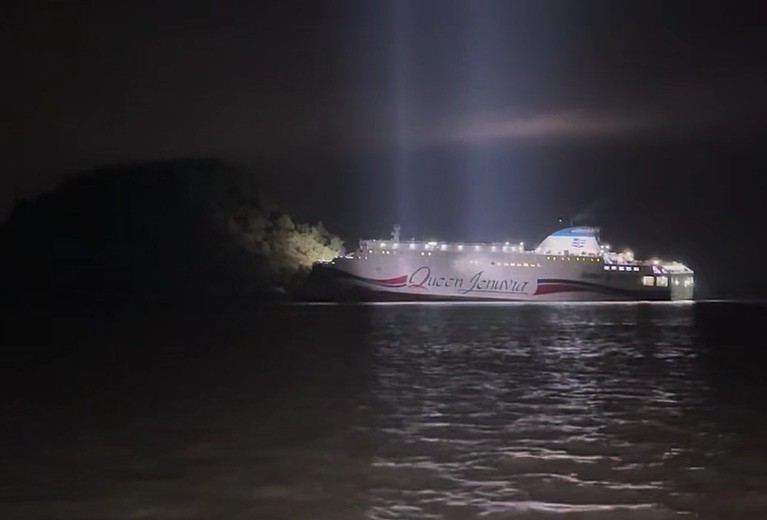 19일 오후 8시 17분께 전남 신안군 장산도 남방 족도에 여객선 퀸제누비아2호가 좌초돼 해경이 구조 작업을 벌이고 있다. 2025.11.19 [목포해경 제공