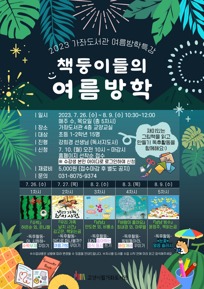 [부자동네타임즈 김인수기자] 가좌도서관은 오는 7월 26일부터 8월 9일까지 매주 수요일과 목요일에 어린이 여름방학 독서 프로그램 ‘책둥이들의 여름방학’을 운영한다.