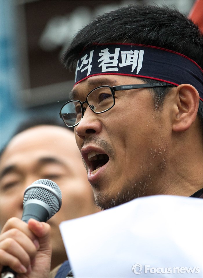 | △ 지난 10일 오후 폭력시위를 주도한 혐의로 수배된 한상균 민주노총 위원장이 피신처인 서울 종로구 조계사를 떠나기 전 기자회견을 하고 있다. <사진제공=포커스뉴스> |