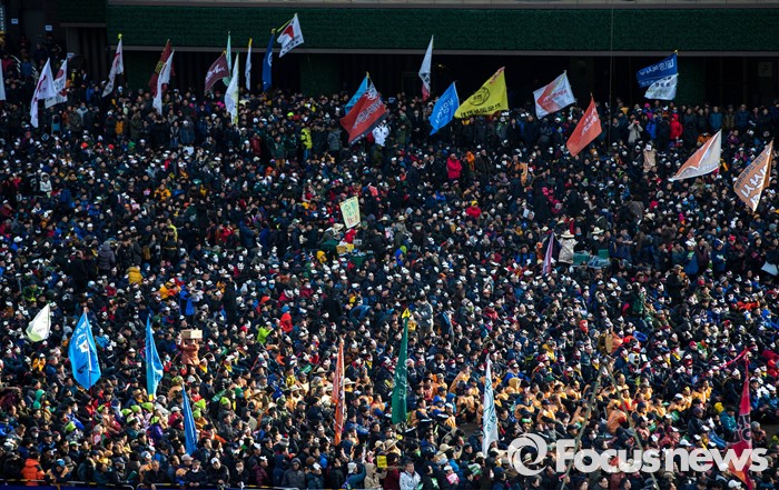 △ 지난 5일 오후 서울 시청 앞 광장에서 열린 제2차 민중총궐기대회에 집회 참가자들이 집결해 있다. <사진제공=포커스뉴스>