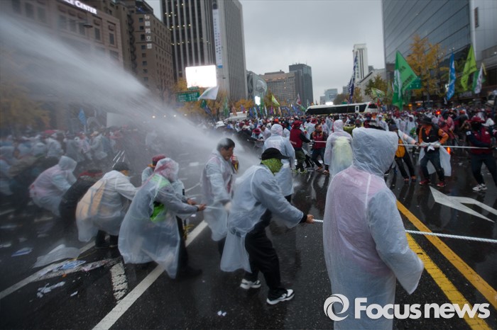 △ 지난달 14일 오후 서울 종로구 세종대로에서 열린 정부 규탄 '민중총궐기 투쟁대회'에서 경찰이 시위대를 향해 물대포를 쏘고 있다. <사진제공=포커스뉴스>
