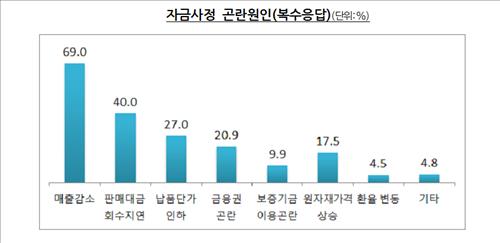자금사정이 곤란한 이유(복수응답)로 매출감소(69.0%)라고 답한 기업이 가장 많았고, 판매대금 회수지연(40.0%)과 납품단가 인하(27.0%) 등이 뒤따랐다.