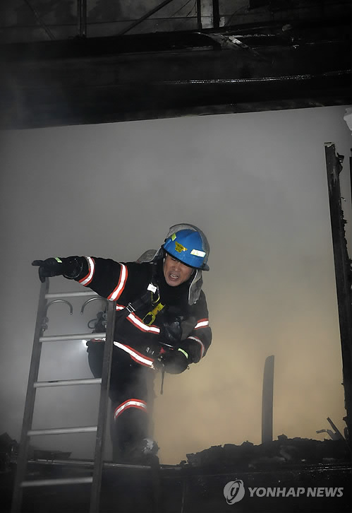 | △ 페인트점서 난 불이 빌라로 옮아붙어…한밤 대피 소동 (서울=연합뉴스) 1일 오전 3시 32분께 서울 서초구 반포동의 한 페인트대리점에서 화재가 발생했다. 인명피해는 없었지만 인근 주민 20명이 급히 대피하는 소동이 벌어졌고, 페인트대리점 건물과 인근 빌라 및 음식점 일부가 불에 타 소방서 추산 1억2천만원의 재산피해가 발생했다. 이날 화재 현장에서 한 소방관이 진화작업을 하고 있다. 2015.2.1 << 서울소방재난본부 제공 >> photo@yna.co.kr |