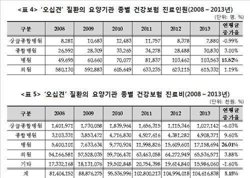 이에 비해 수술 진료 인원은 같은 기간 연평균 28.1%나 늘었다. 2008년 2천744명이던 수술 진료 인원은 2013년에는 9천457명으로 3.5배나 증가했다.