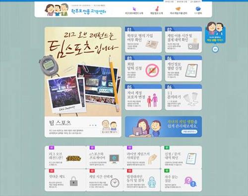 페이지는 크게 ▲ 리그 오브 레전드 소개 ▲ 게임 법규 소개 ▲ 자녀 게임 이용 관리 ▲ 1:1문의 등으로 구성됐다.