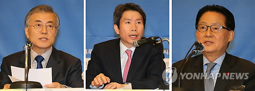 | △ 야당 대표 후보, 을지로위원회 초청 토론회 (서울=연합뉴스) 백승렬 기자 = 새정치민주연합 2·8전당대회 당대표에 출마한 박지원(오른쪽부터)·이인영·문재인 후보가 5일 국회 도서관에서 '을'을 위한 민생정당 어떻게 만들 것인가?'란 주제로 열린 을지로위원회 당대표 후보 초청 토론회에서 토론을 벌이고 있다. |