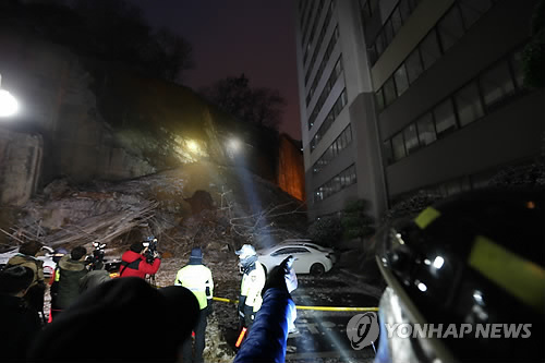 (광주=연합뉴스) 장덕종 기자 = 5일 새벽 광주의 한 아파트 인근 옹벽이 붕괴해 주차된 차량 수십대가 묻히고 파손되는 큰 피해를 입었다.