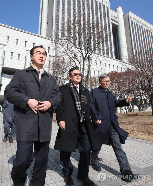 | △ (서울=연합뉴스) 김도훈 기자 = 2007년 남북정상회담 회의록 폐기를 공모한 혐의로 기소된 백종천 전 청와대 외교안보실장(가운데)과 조명균 전 청와대 안보정책비서관(왼쪽)이 6일 서울 서초구 서울중앙지법에서 열린 선고공판에서 무죄를 선고 받은 뒤 법원 건물을 나서고 있다. 오른쪽은 이종석 전 통일부 장관. |