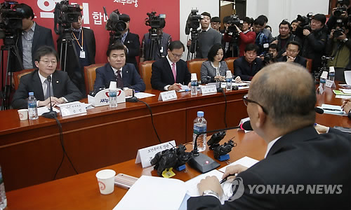 △ 발언 듣는 새누리당 원내지도부 (서울=연합뉴스) 이상학 기자 = 새누리당 유승민 원내대표와 원유철 정책위의장이 6일 오후 국회에서 열린 건강보험료 개편 관련 당정 현안보고에서 문형표 보건복지부 장관의 발언을 듣고 있다.